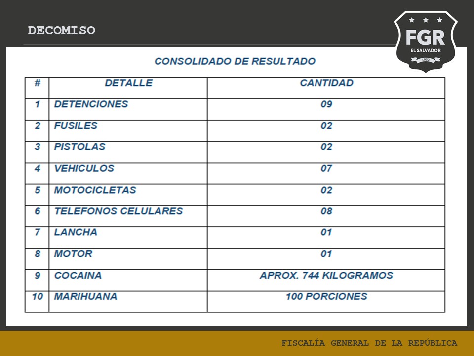El Fiscal General de la República, Rodolfo Delgado, junto al Ministro de Seguridad Pública, Gustavo Villatoro, Ministro de la Defensa Rene Merino Monroy, y el director de la Policía Nacional Civil, Mauricio Arriaza Chicas, confirmaron el resultado de una operación que de forma conjunta llevó a desarticular estructuras de narcotraficantes que operaban en los departamentos de La Paz y San Miguel, donde se logró la incautación de 744 kilogramos de Cocaína, con un valor comercial de aproximadamente US$18,704,160.00.