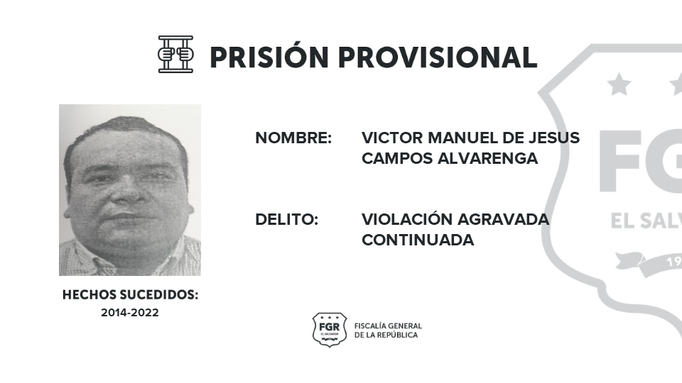 Sonsonate. La Fiscalía General de la República (FGR) ha conseguido que se le decretara la medida de prisión provisional a Víctor Manuel de Jesús Campos Alvarenga, quien se desempeñaba como sacerdote y quien es acusado del delito de violación agravada continuada.