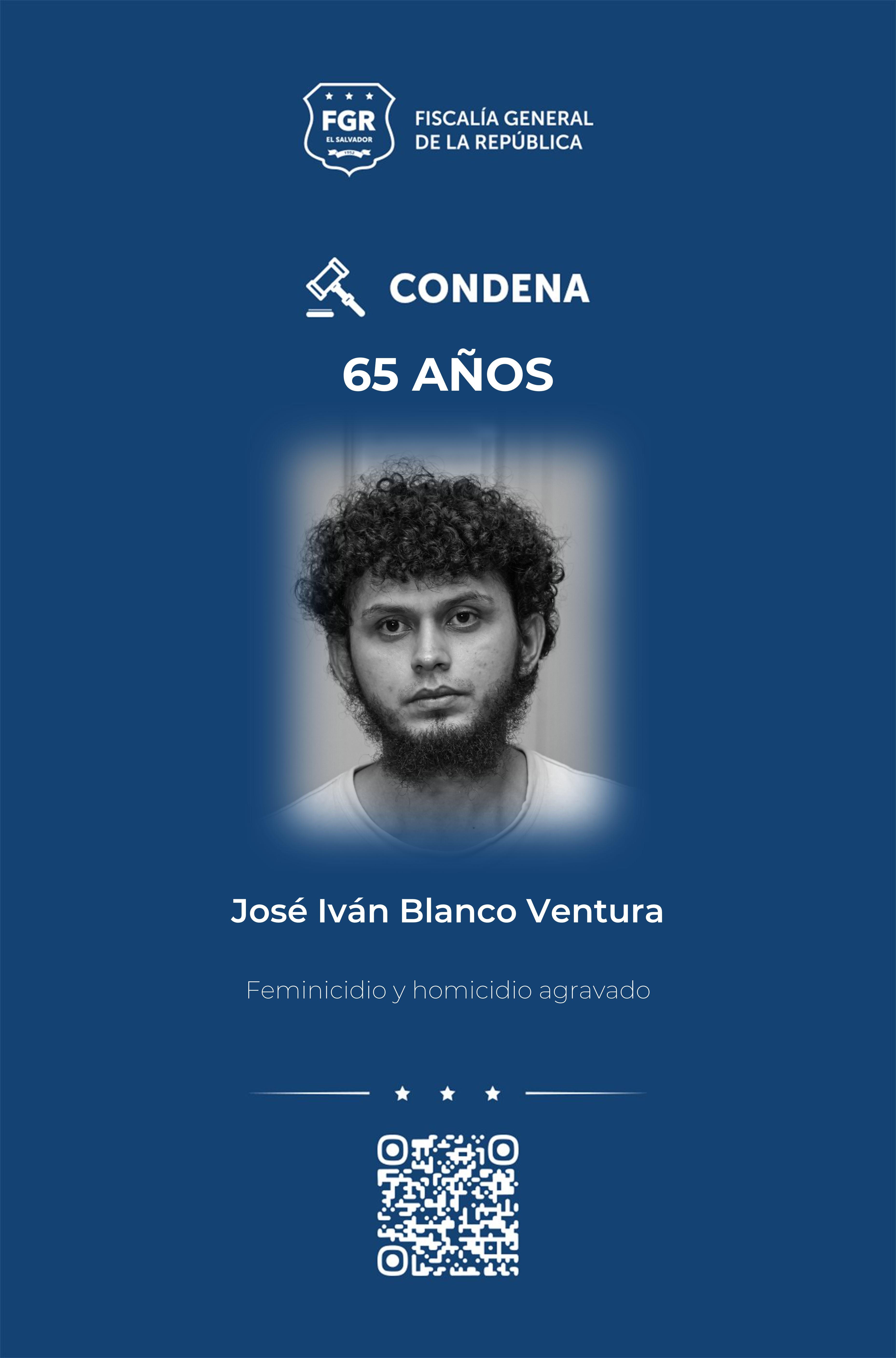La Paz. La Fiscalía General de la República (FGR) recibió, en el Aeropuerto Internacional San Óscar Arnulfo Romero, al salvadoreño José Iván Blanco Ventura y lo puso a disposición de las autoridades penitenciarias para que comience a cumplir la condena de 65 años por feminicidio y homicidio agravado.
