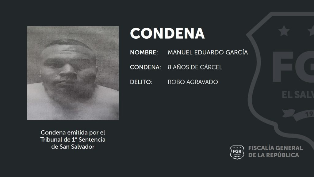 La San Salvador. La Fiscalía General de la República por medio de su Oficina en San Salvador dio a conocer la condena de 8 años de prisión en contra de un sujeto que fue declarado culpable por dedicarse a asaltar, principalmente en zonas de mayor movimiento comercial. También informó sobre una sanción de 7 años de internamiento que deberá cumplir un adolescente en conflicto con la ley.