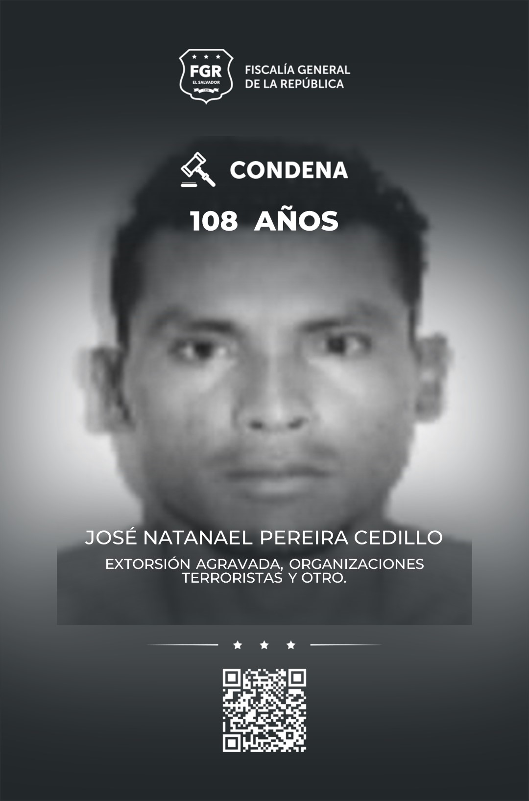 Alexis Asael Argueta Climaco, alias cuervo (presente), fue condenado a 112 años de prisión por 5 extorsiones agravadas, organizaciones terroristas y un caso de actos preparatorios, proposición, conspiración y asociaciones delictivas.