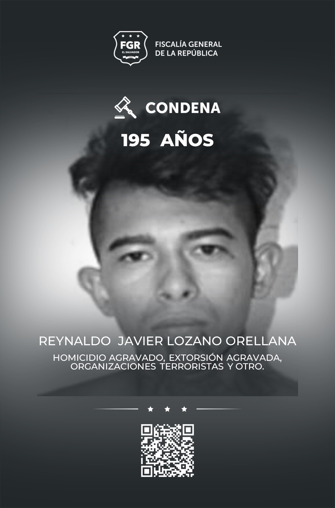 El terrorista Reynaldo Javier Lozano Orellana, alias strick (presente), recibió 195 años de cárcel por dos homicidios agravados, 6 extorsiones agravadas, organizaciones terroristas, un caso de actos preparatorios, proposición, conspiración y asociaciones delictivas.