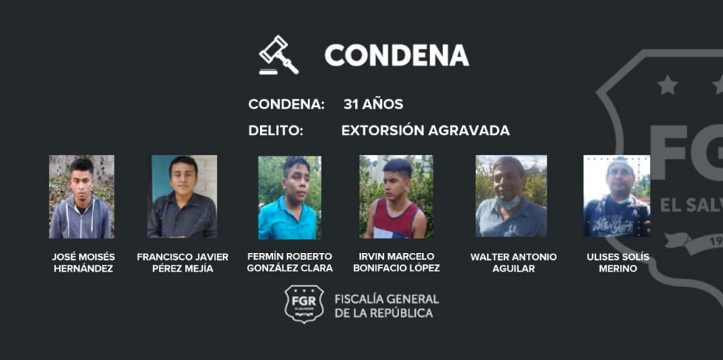 Santa Tecla. 31 años de cárcel para 6 pandilleros del Barrio 18, por el delito de Extorsión Agravada fue el logro de la Unidad Especializada de Extorsión y Crimen Organizado de la FGR, tras presentar una investigación robusta.