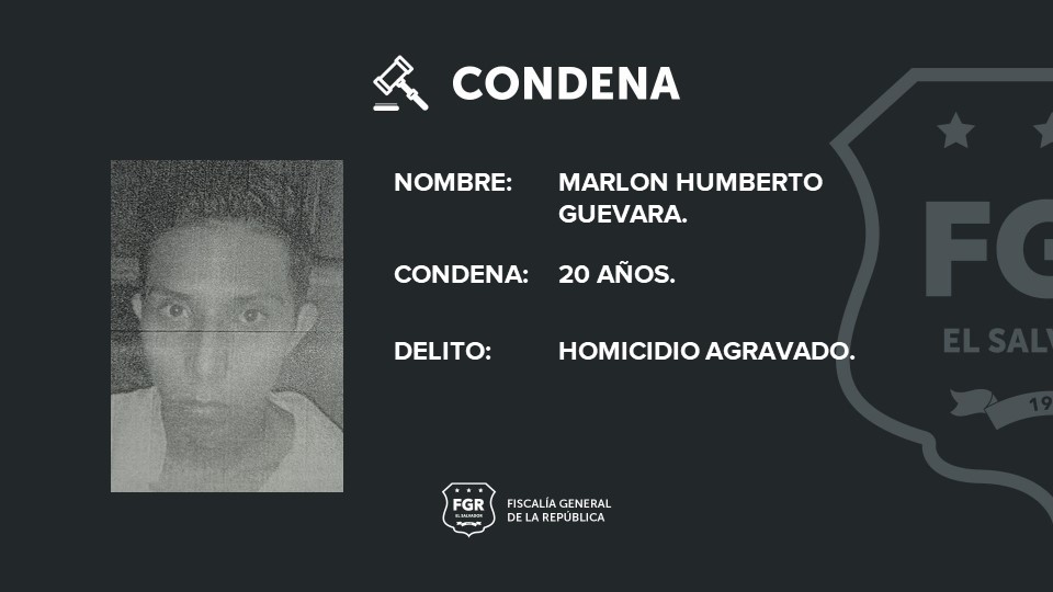 San Miguel. A 20 años de cárcel fue condenado Marlon Humberto Guevara Hernández, miembro de la Mara Salvatrucha, por el homicidio de Kevin Eduardo Martínez Alvarado. La Fiscalía General de la República (FGR) demostró con pruebas testimoniales, técnica y científicas que el 6 de diciembre de 2018, el imputado mató a su víctima luego de atacarla con arma de fuego y arma blanca.