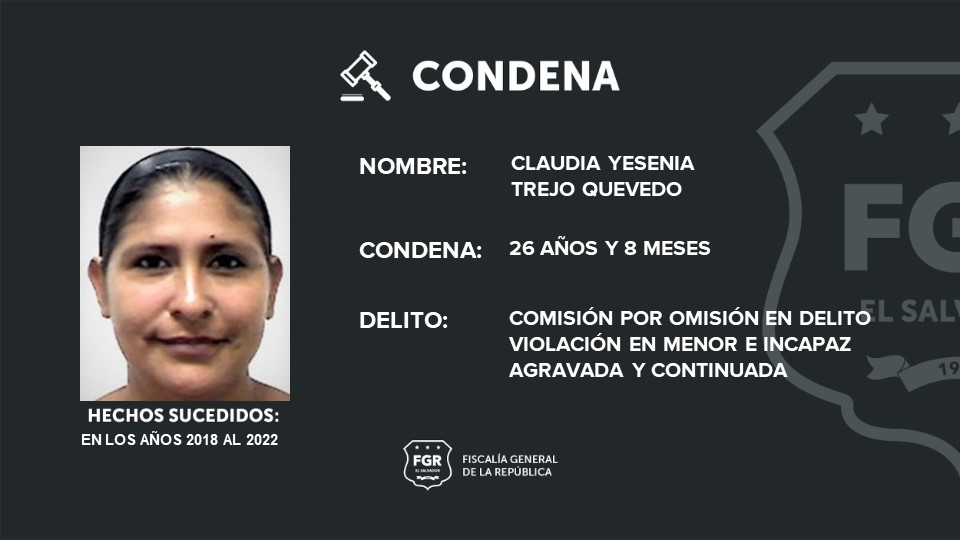 San Salvador. Condenas de 26 años y 8 meses en prisión deberán cumplir Jerlin Alexander López y Claudia Yesenia Trejo Quevedo; a López se le procesó por el delito de violación en menor o incapaz agravada y continuada, y a Quevedo por la comisión por omisión de violación. En el respectivo juicio la Fiscalía evidenció la culpabilidad de cada imputado.