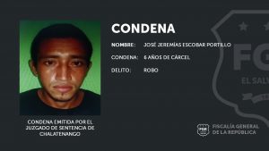 Chalatenango. Fiscales de la Unidad de Patrimonio Privado y Propiedad Intelectual de la sede en Chalatenango lograron que se decretara una sentencia condenatoria de seis años de prisión en contra de José Jeremías Escobar Portillo, de 22 años, acusado del delito de Robo, en perjuicio de dos comerciantes; el hecho ocurrió el 22 de abril de 2021, en el municipio de El Paraíso, del departamento de Chalatenango.