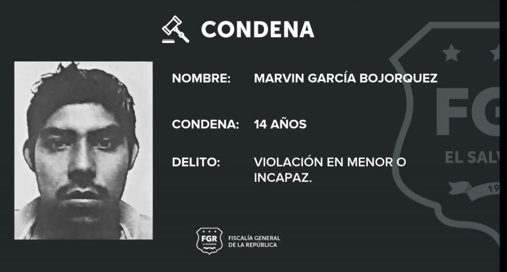 San Salvador. La Fiscalía General de la República logró que Marvin García Bojórquez sea condenado a una pena de 14 años de cárcel, esto después que se le comprobó, al final del juicio, que es el responsable de la violación de una menor de edad.
