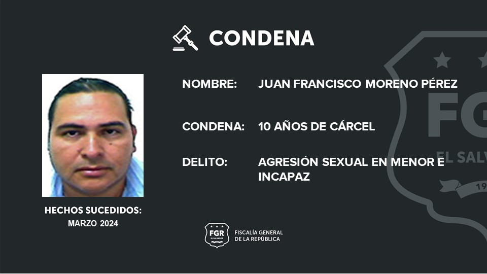 Chalatenango. La Fiscalía General de la República (FGR) logró pena de prisión para Juan Francisco Moreno Pérez por haber tocado el cuerpo de una víctima de 11 años de edad, durante marzo del 2024.