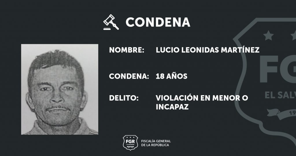 San Vicente. Lucio Leónidas Martínez fue condenado a 18 años de prisión por el delito de Violación en Menor. Los hechos ocurrieron en el mes de octubre del año 2021, luego que la víctima regresaba de un retiro escolar, en horas de la tarde.