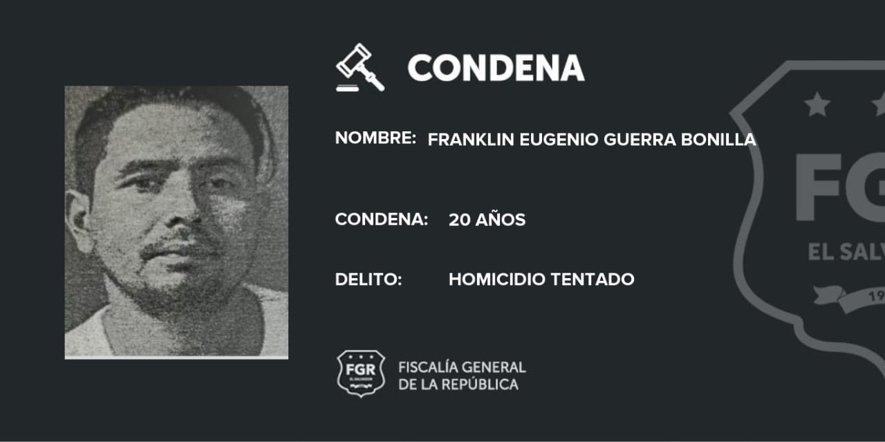 Chalatenango. Franklin Eugenio Guerra Bonilla fue sentenciado a 20 años de cárcel por intentar asesinar a Gilberto Rivera Martínez, en un asalto. Los hechos sucedieron el 30 de abril 2021, en el municipio San Rafael, Chalatenango. Para la sentencia, la Fiscalía logró evidenciar la participación directa del imputado en los hechos.