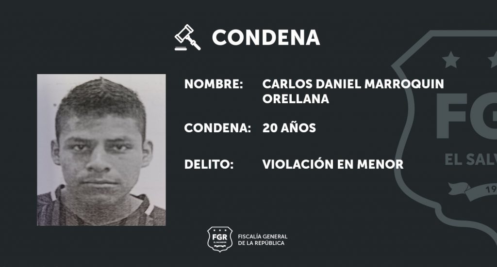 San Vicente. Luego de dos días de juicio y gracias a la abundante prueba presentada por la Fiscalía, se logró obtener una condena de 20 años de prisión para Carlos Daniel Marroquín Orellana, por el delito de Violación en Menor, modalidad Continuada.