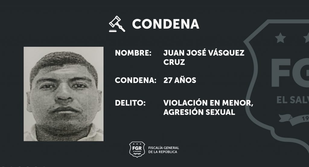 Cojutepeque. La Fiscalía logró condenar a Juan José Vásquez Cruz a 27 años de cárcel por los delitos de Violación en Menor y Agresión Sexual, ambos en la modalidad Agravada.