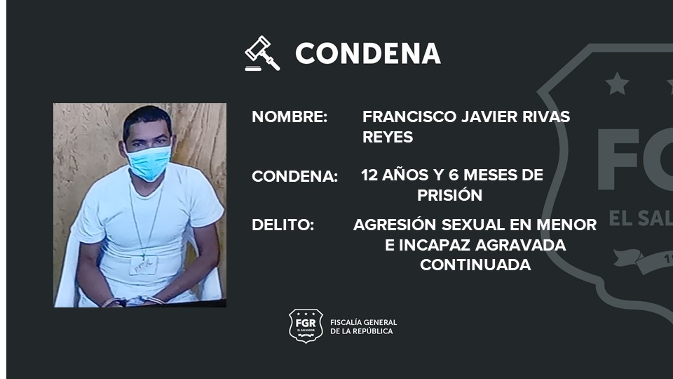 La Libertad. Gracias a los elementos probatorios presentados por la Fiscalía General de la República (FGR) en un juicio, se logró condenar a Francisco Javier Rivas Reyes a 12 años y 6 meses de cárcel, por agredir sexualmente a una niña de 4 años, en el municipio y departamento de La Libertad.