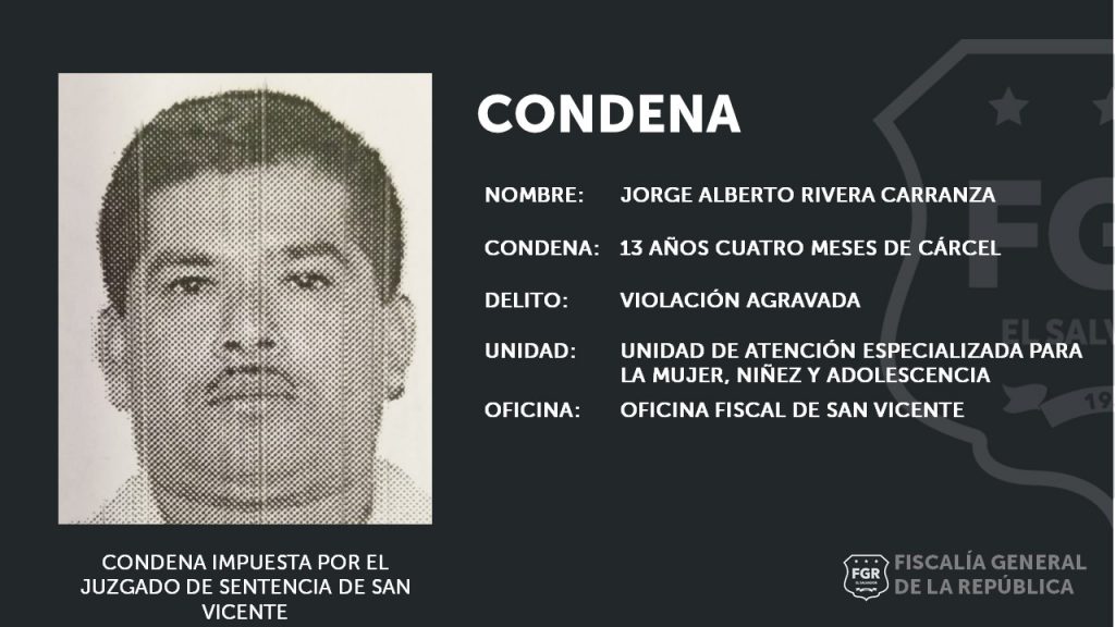 San Vicente. Una condena de 13 años y 4 meses de prisión le fue impuesta al imputado Jorge Alberto Jiménez Carranza, a quien fiscales de la Unidad de Atención Especializada de la Mujer, Niñez y Adolescencia de la oficina de San Vicente procesaron por el delito de Violación en Menor e Incapaz.