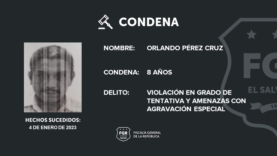 Ilobasco. La Fiscalía General de la República consiguió que Orlando Pérez Cruz fuera sentenciado a ocho años de prisión por los delitos de violación en grado de tentativa y amenazas con agravación especial en perjuicio de una mujer.
