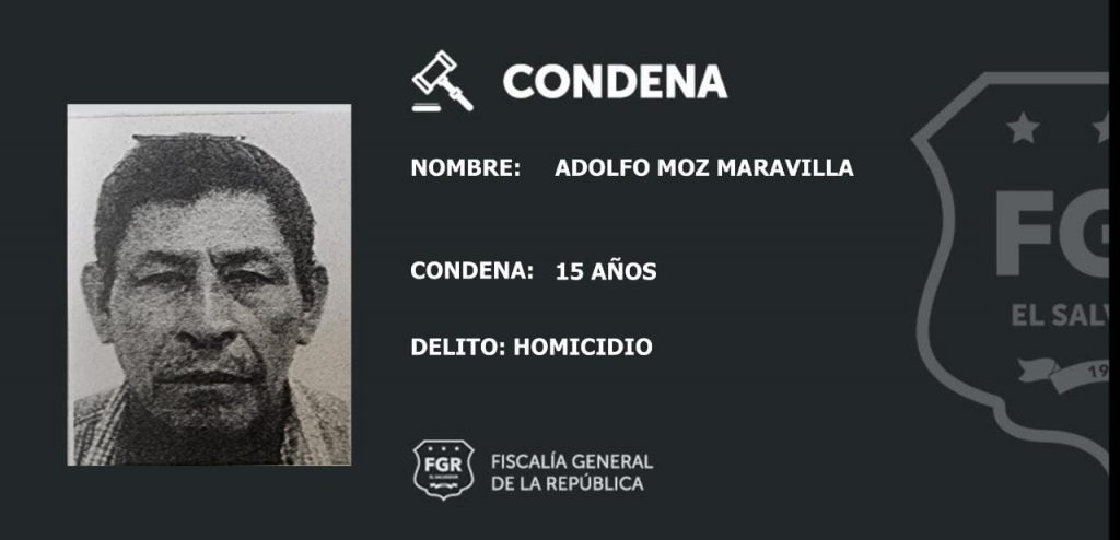 Zacatecoluca, La Paz. El 28 de diciembre de 2019, en comunidad San Luis Jalponguita del municipio de Santiago Nonualco, departamento de La Paz, al sur de San Salvador, Adolfo Moz Maravilla irrumpió en una fiesta navideña y mató a una de las personas que se encontraba departiendo en el lugar; por su crimen, la Fiscalía logró una condena de 15 años de prisión.