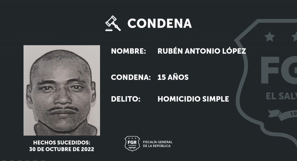 Zacatecoluca, La Paz. Debido a las pruebas presentadas por los fiscales se logró condenar a 15 años de prisión a Rubén Antonio López, por el delito de homicidio simple, en perjuicio de una persona.