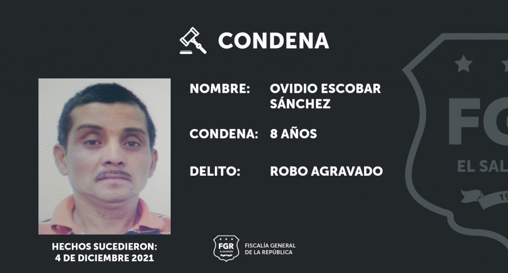 Cojutepeque, Cuscatlán. Gracias a las sólidas pruebas presentadas por los fiscales se ha logrado condenar a un sujeto a 8 años de prisión por el delito de robo agravado. El sentenciado ha sido identificado como Ovidio Escobar Sánchez.