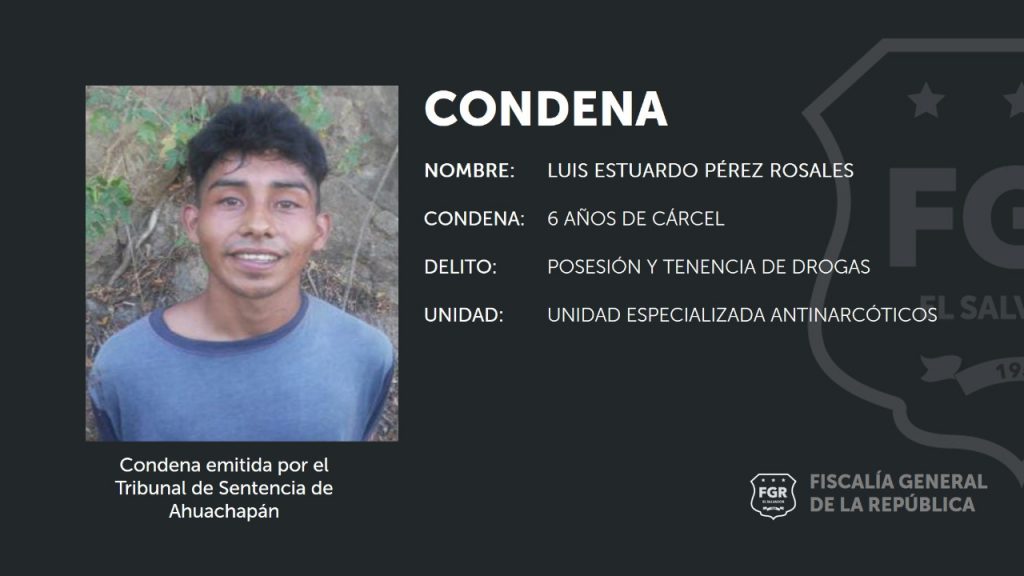 Ahuachapán. Fiscales de la Unidad Especializada de Delitos de Narcotráfico lograron una condena de 6 años de prisión para Luis Estuardo Pérez Rosales, por el delito de Posesión y Tenencia de Drogas en perjuicio de la Salud Pública.