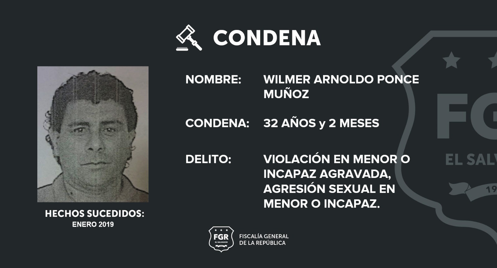 Cojutepeque, Cuscatlán. Wilmer Arnoldo Ponce Muñoz ha sido condenado a 32 años y 2 meses de prisión por haber agredido y violado a dos menores de edad.