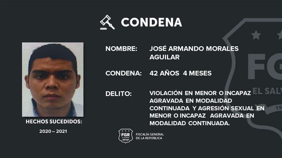 Usulután. José Armando Morales Aguilar fue sentenciado a 42 años y 4 meses de prisión por agresión sexual en menor o incapaz agravada en modalidad continuada y violación en menor o incapaz en modalidad continuada.