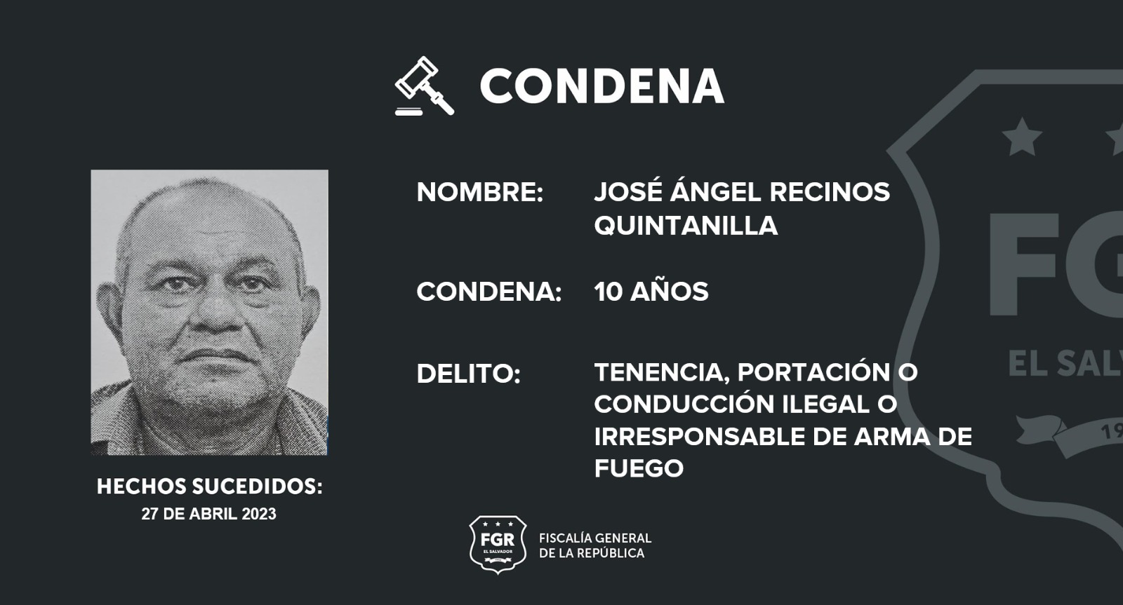 Zacatecoluca, La Paz. Gracias a la oportuna intervención de las autoridades, José Ángel Recinos Quintanilla fue condenado a 10 años de prisión por el delito de tenencia, portación o conducción ilegal o irresponsable de arma de fuego