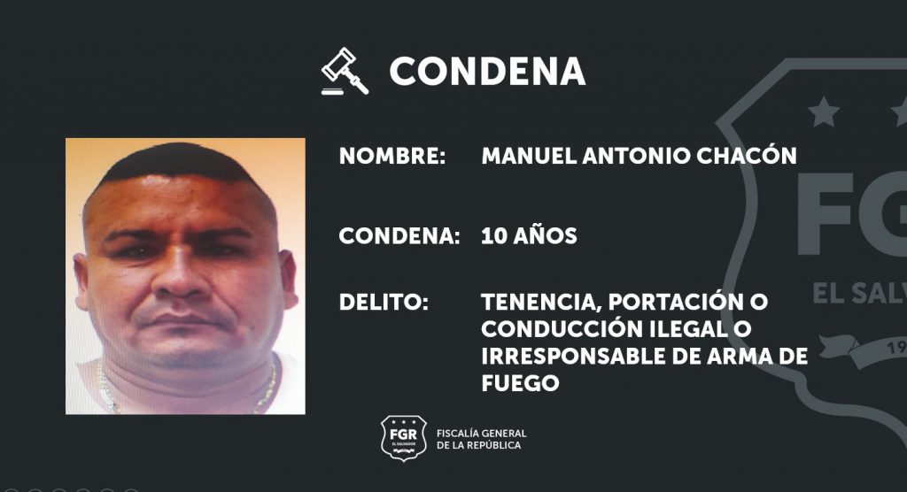 Cojutepeque, Cuscatlán. Gracias a los contundentes elementos probatorios presentados por los fiscales, se logró condenar a Manuel Antonio Chacón a 10 años de prisión por el delito de tenencia, portación o conducción ilegal o irresponsable de arma de fuego.