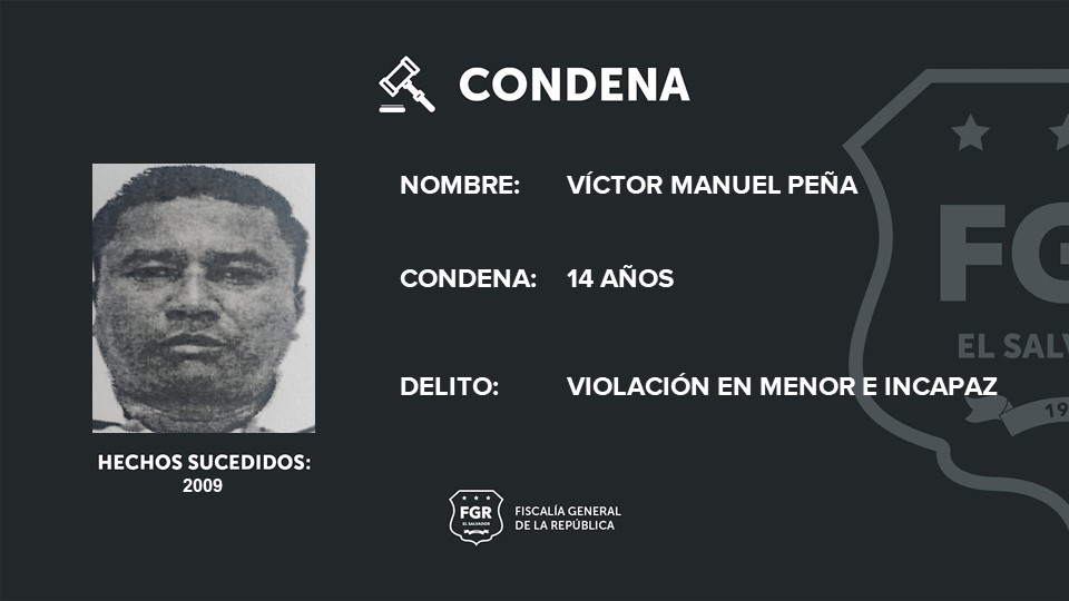 Tras la debida investigación realizada por la Fiscalía y al contar con pruebas que incriminaban al imputado, el Tribunal Primero de sentencia de Sonsonate impuso la sentencia de cárcel a Peña por el delito de violación en menor e incapaz.