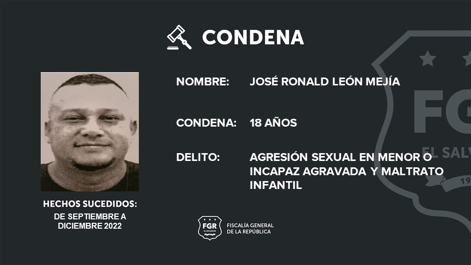 Santa Tecla. A 18 años de prisión fue condenado José Ronald León Mejía por haber agredido sexualmente a una niña de 7 años de edad y por maltratar física y psicológicamente a otra víctima de dos años en Quezaltepeque, La Libertad Norte.