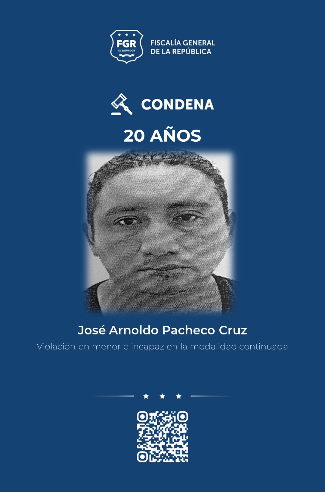 La Libertad Sur. La Fiscalía General de la República (FGR) logró que José Arnoldo Pacheco Cruz fuera condenado a 20 años de prisión por el delito de violación en menor e incapaz, en modalidad continuada, en contra de una niña.