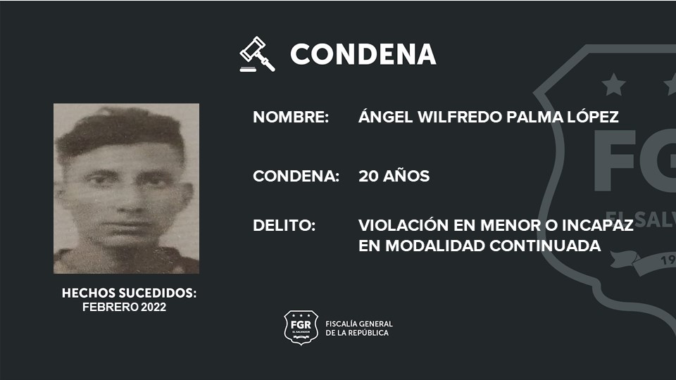 Santa Tecla, La Libertad. Gracias a las abundantes pruebas presentadas en juicio, la Fiscalía General de la Fiscalía (FGR) logró hacer justicia para una menor de edad, quien fue abusada sexualmente, por Ángel Wilredo Palma López; al imputado se le condenó a 20 años de prisión.
