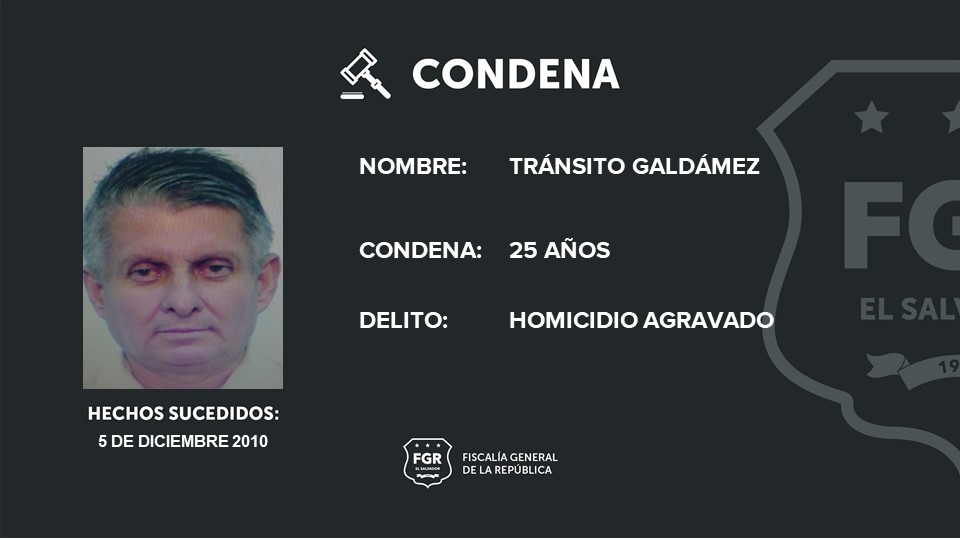 Santa Tecla, La Libertad Sur. A 25 años de prisión fue condenado Tránsito Galdámez por haber asesinado con arma blanca a un familiar. El homicidio agravado fue cometido el 5 de diciembre de 2010, en San Pablo Tacachico, La Libertad Norte.