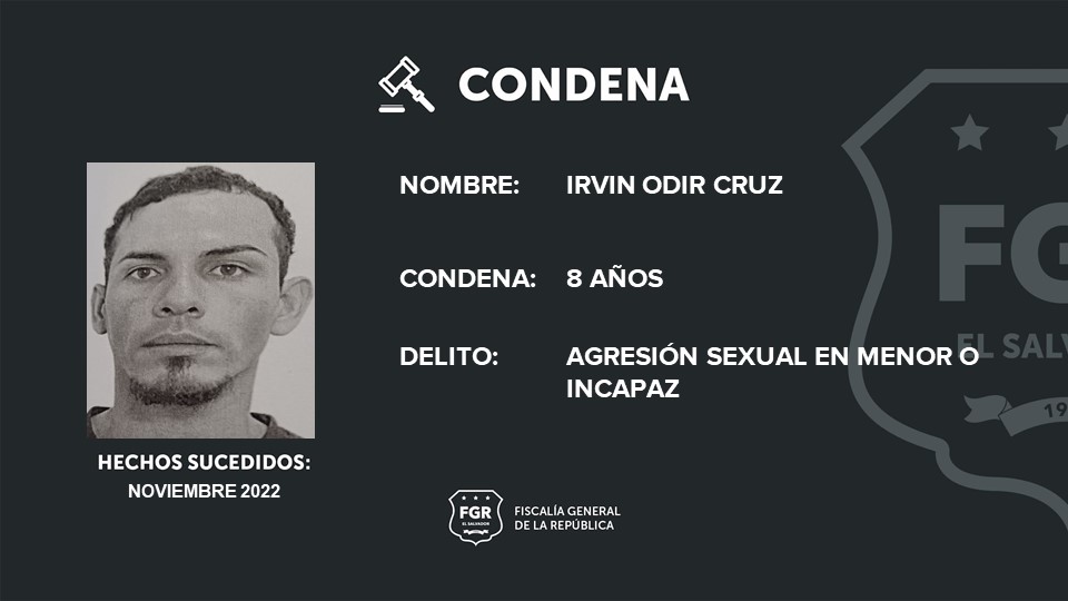 Santa Tecla. Irvin Odir Cruz fue condenado a ocho años de cárcel por el delito de agresión sexual en menor o incapaz. Los abusos fueron cometidos en noviembre del 2022 en Quezaltepeque, La Libertad Norte.