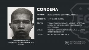 Mejicanos. La Unidad de Atención Especializada para la Mujer, Niñez y Adolescencia de la sede fiscal de Mejicanos logró que un tribunal impusiera una condena de 42 años y 8 meses de cárcel para René Alfredo Quintanilla Pérez, por los delitos de Violación Agravada en Menor y Agresión Sexual en Menor, ambos en modalidad Continuada.