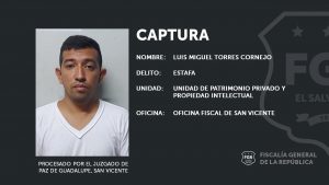San Vicente. Fiscales de la Unidad de Delitos de Patrimonio Privado de la oficina de San Vicente lograron que el Tribunal de Paz del municipio de Guadalupe, en este departamento, enviara a prisión a Luis Miguel Torres Cornejo, quien está acusado de estafar a varias personas con la promesa de venta de vehículos traídos desde los Estados Unidos de Norteamérica.
