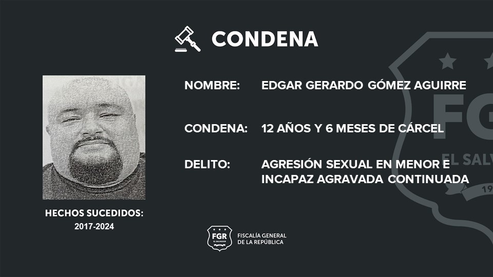 La Libertad Este. La Fiscalía General de la República (FGR) logró una pena de 12 años y 6 meses de cárcel para Edgar Gerardo Gómez Aguirre, quien fue declarado culpable de haber agredido sexualmente a una menor desde que tenía 7 años de edad. Los tocamientos fueron cometidos entre los años 2017 al 2024 en Ciudad Merliot, La Libertad Sur.