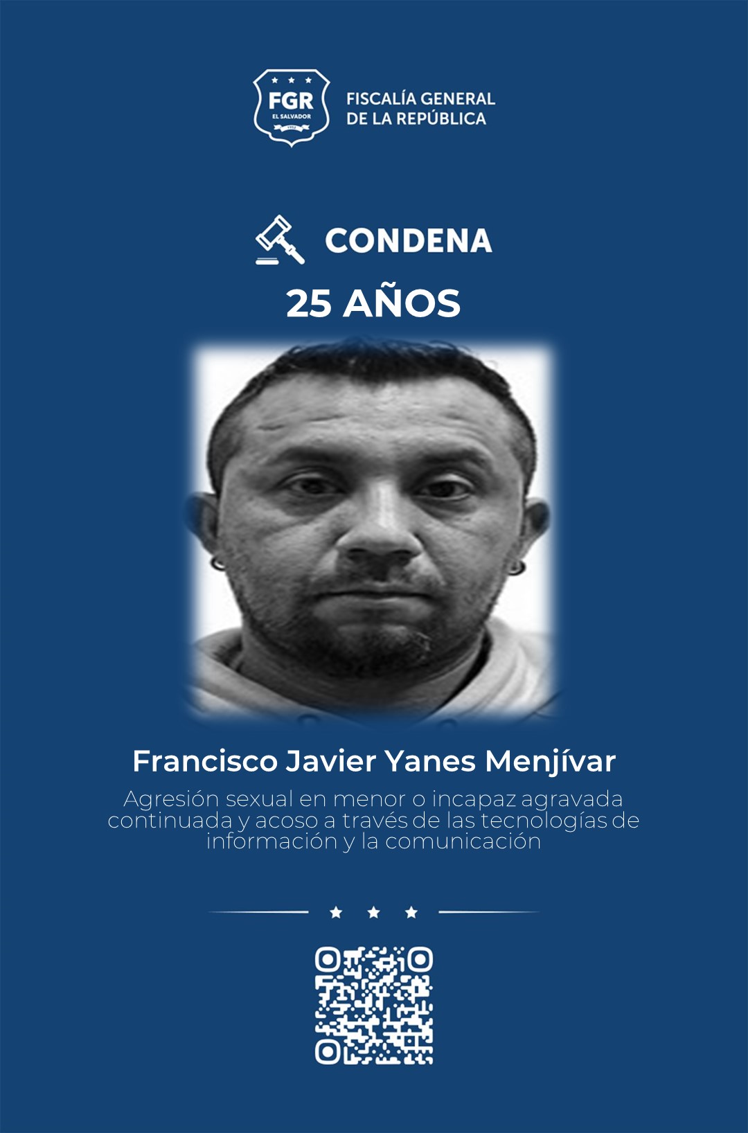 Chalatenango. La Fiscalía General de la República (FGR) logró 25 años de prisión para Francisco Javier Yanes Menjívar, por haber agredido y acosado sexualmente a una niña desde que tenía seis años de edad. Los abusos se cometieron durante los años 2015 al 2024 en Barrio El Centro, Chalatenango Sur.