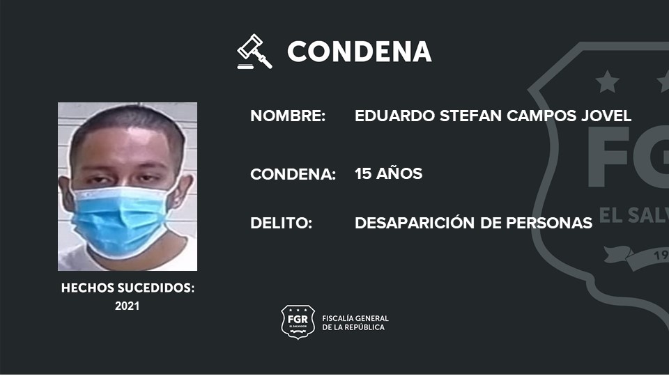 Santa Tecla, la Libertad. Eduardo Stefan Campos Jovel, alias “Chilipuca”, fue condenado a 15 años de prisión por haber desaparecido a una víctima en septiembre del año 2021, en el cantón El Progreso del municipio de Santa Tecla, La Libertad. El imputado fue perfilado como colaborador de la MS-13 de la clica “Joya de Ceren Locos Salvatruchos”.
