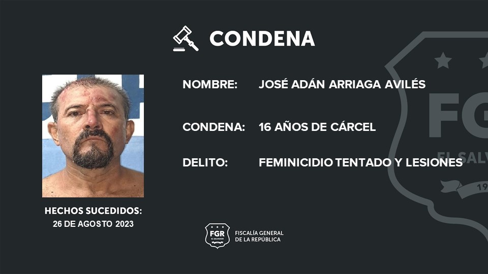 Santa Tecla, La Libertad Sur. A 16 años de prisión fue condenado José Adán Arriaga Avilés por los delitos de feminicidio tentado y lesiones en perjuicio de dos mujeres. Los hechos por los que fue condenado los cometió el 26 de agosto del 2023 en la jurisdicción de Colón, La Libertad Oeste.