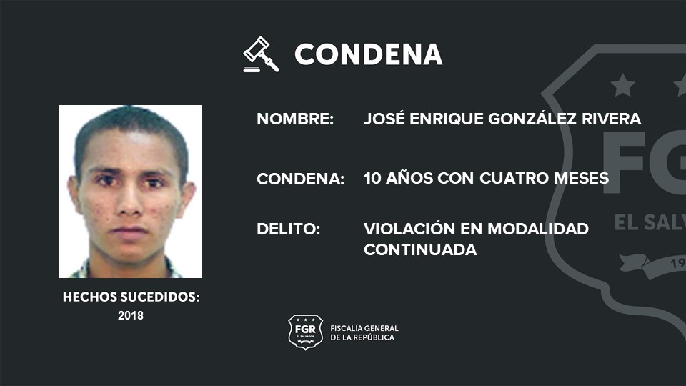 Chalatenango. La Fiscalía General de la República (FGR) logró 10 años y cuatro meses de prisión para José Enrique González Rivera por haber abusado sexualmente de una señora de 58 años de edad. Los hechos que se le atribuyen los perpetró en reiteradas ocasiones a finales del mes de mayo del 2018, en el cantón Santa Rosa, del municipio de Nueva Concepción, Chalatenango.