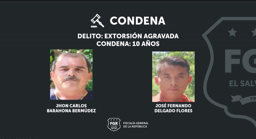 Cojutepeque, Cuscatlán. Gracias a las pruebas presentadas por los fiscales se ha logrado condenar a Jhon Carlos Barahona Bermúdez y José Fernando Delgado Flores a 10 años de cárcel, por el delito de extorsión agravada.