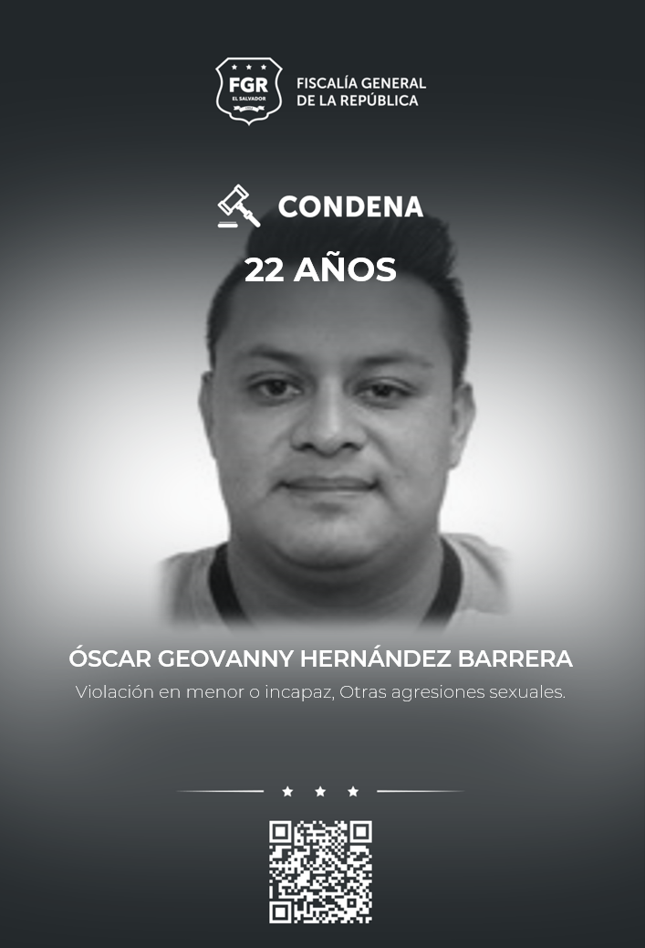 Apopa, San Salvador Oeste. José Aníbal Alvarado Méndez y Oscar Geovanny Hernández Barrera fueron condenados a 22 años de prisión, cada uno, por los delitos de violación en menor o incapaz y otras agresiones sexuales, ambos en su modalidad de delito continuado.