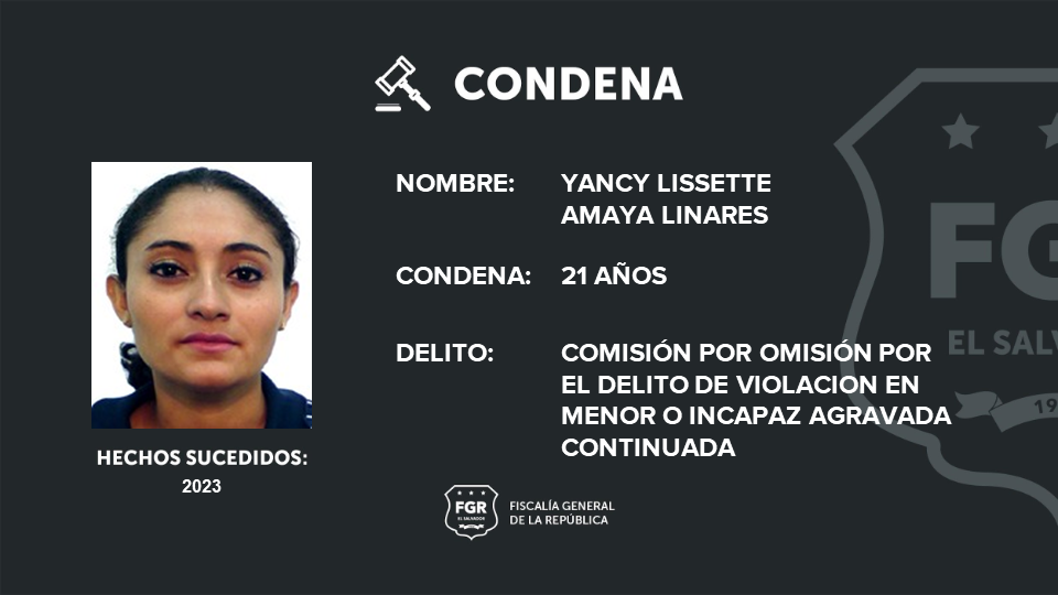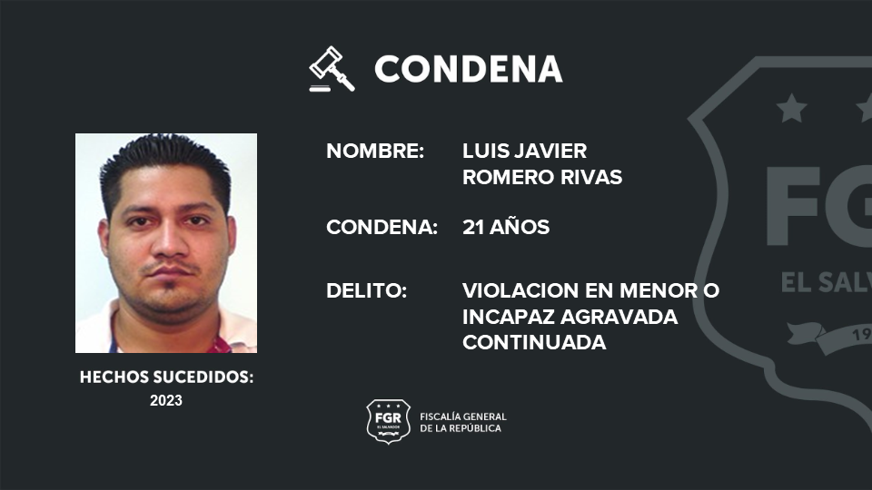 San Salvador. 21 años de prisión es la condena impuesta a Luis Javier Romero Rivas y Yancy Lissette Amaya Linares. El hombre fue procesado por el delito de violación en menor e incapaz agravada continuada y la segunda, por omisión por el delito de violación en menor e incapaz agravada continuada en perjuicio de una menor de edad.
