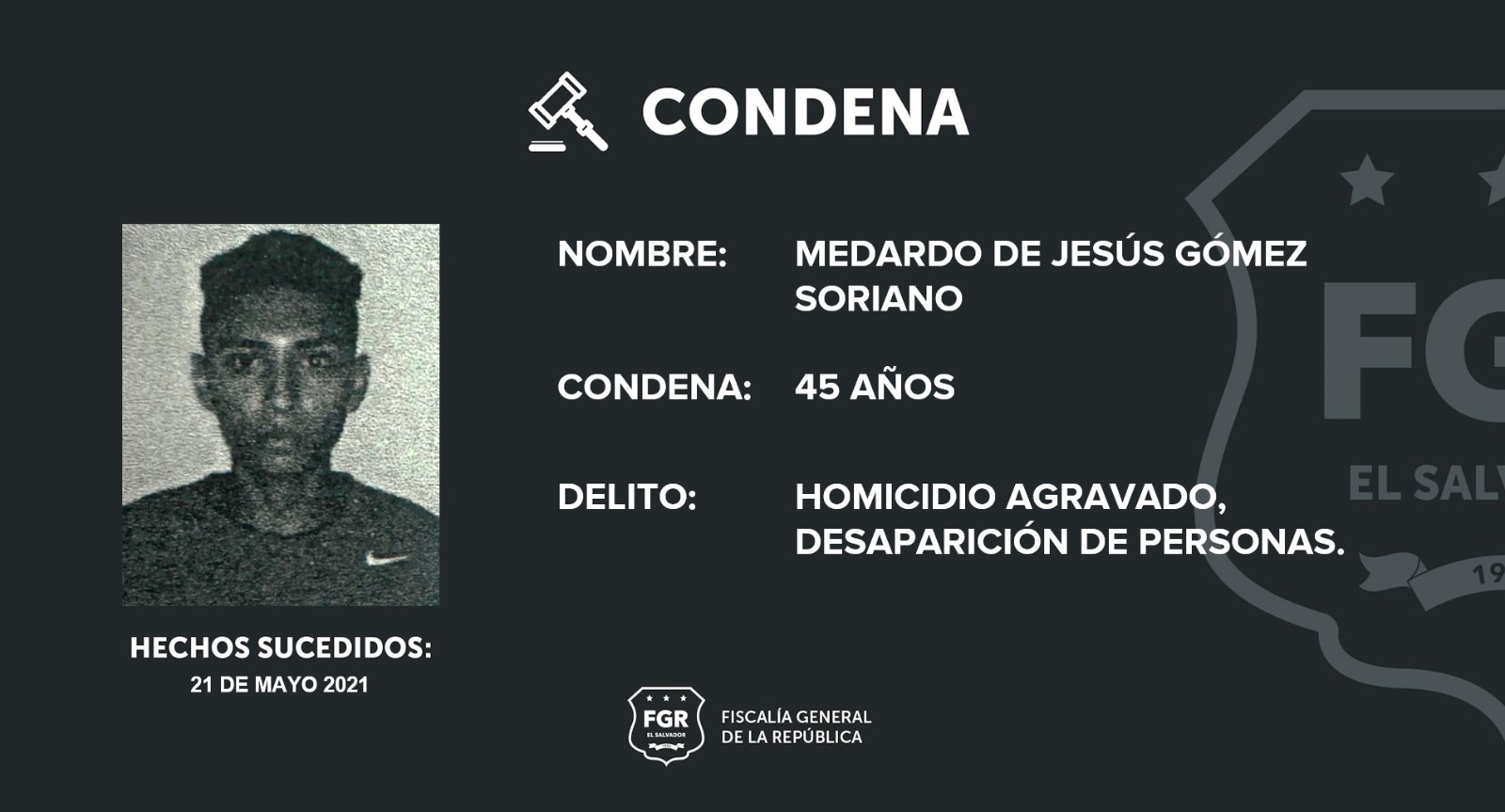 Zacatecoluca, La Paz. Luego de una extensa investigación y dos días de juicio, la Fiscalía logró que se condenara a 45 años de prisión a Medardo de Jesús Gómez Soriano, alias Marihuana, por los delitos de homicidio agravado y desaparición de personas. El imputado es miembro activo de la pandilla MS-13.