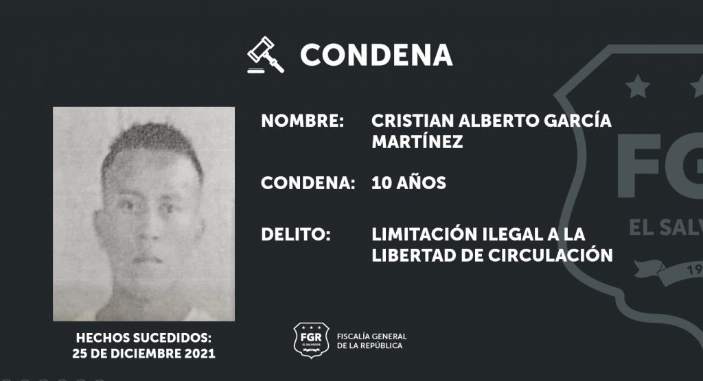 El imputado fue identificado como Cristian Alberto García Martínez, miembro de la Mara Salvatrucha, MS-13, y fue procesado por el delito de Limitación Ilegal a la Libertad de Circulación.