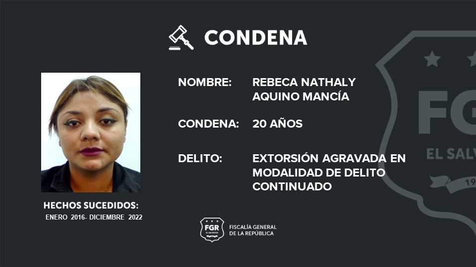 Santa Ana. Rebeca Nathaly Aquino Mancía, es una integrante de la Mara Salvatrucha, con el rango de homegirl, y fue condenada a 20 años por delito de extorsión agravada. En el mes de enero del año 2016, la imputada interceptó a un comerciante ambulante de Santa Ana para exigirle que le entregará dinero a la pandilla y que de no hacerlo le quitarían la vida.
