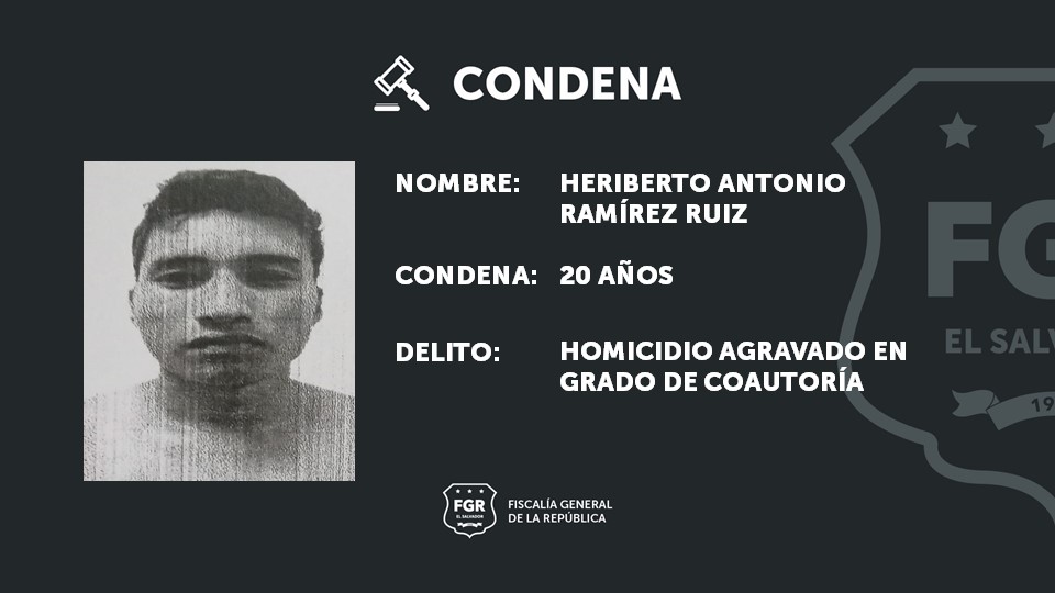 Santa Ana. La Fiscalía General de la República (FGR) demostró con abundante prueba que el pandillero de la MS, Heriberto Antonio Ramírez Ruiz, fue el coautor del homicidio de Miguel Reyes Martínez Quijada, el 28 de abril del año 2019 en Coatepeque, Santa Ana. Al imputado se le impuso una pena de 20 años de cárcel por el crimen.