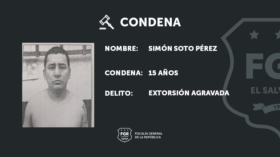 Sonsonate. La Fiscalía continua sumando condenas de cárcel para aquellos pandilleros que por años mantuvieron en zozobra a la población honrada, y de quienes se aprovechaban para extorsionarlos; este es el caso del pandillero activo de la MS, Simón Soto Pérez, quien bajo amenazas le había impuesto una renta de $1,000 dólares mensuales, a un mecánico. Para el imputado el ente fiscal logró una sentencia de 15 años de prisión.
