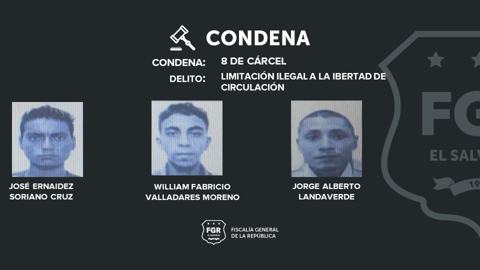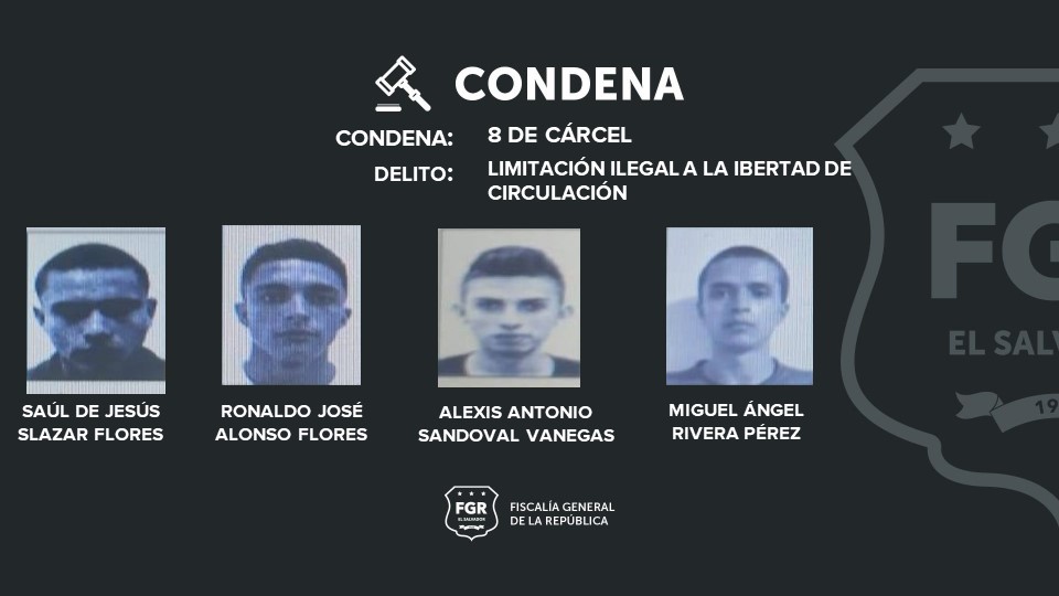 Por ese delito, los imputados Saúl de Jesús Salazar Flores, alias lolo; Ronaldo José Alonso Flores, alias zancudo; Alexis Antonio Sandoval Vanegas, alias el gato; Miguel Ángel Pérez Rivera, alias boca azul; José Ernaidez Soriano Cruz, alias yiro; William Fabricio Valladares Moreno, alias chacuate, y Jorge Alberto Landaverde, alias poliducto, fueron condenados a ocho años de prisión.