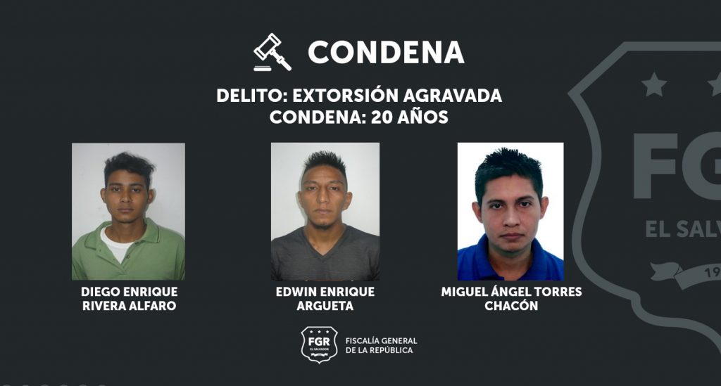 El Tribunal de Sentencia de San Vicente validó toda la prueba presentada por los fiscales del caso, por lo que decidió imponerles la pena máxima establecida para el delito de Extorsión, en su modalidad Agravada.